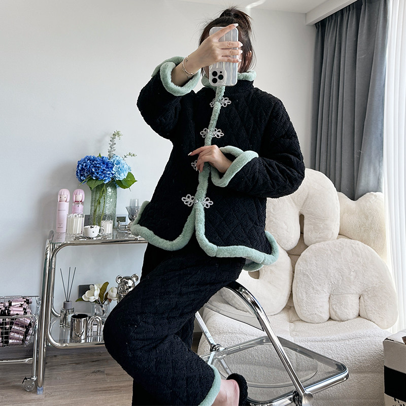 pink grape睡衣女冬季三层夹棉加厚法兰绒珊瑚绒中国风家居服套装