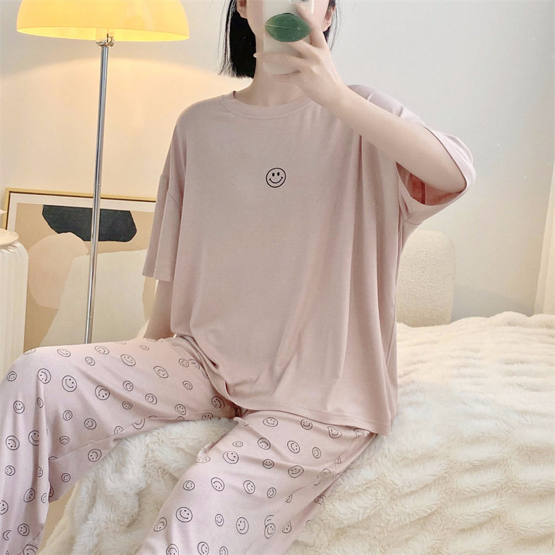 笑脸短袖长裤休闲宽松圆领莫代尔薄款春季睡衣女士套装宽松家居服
