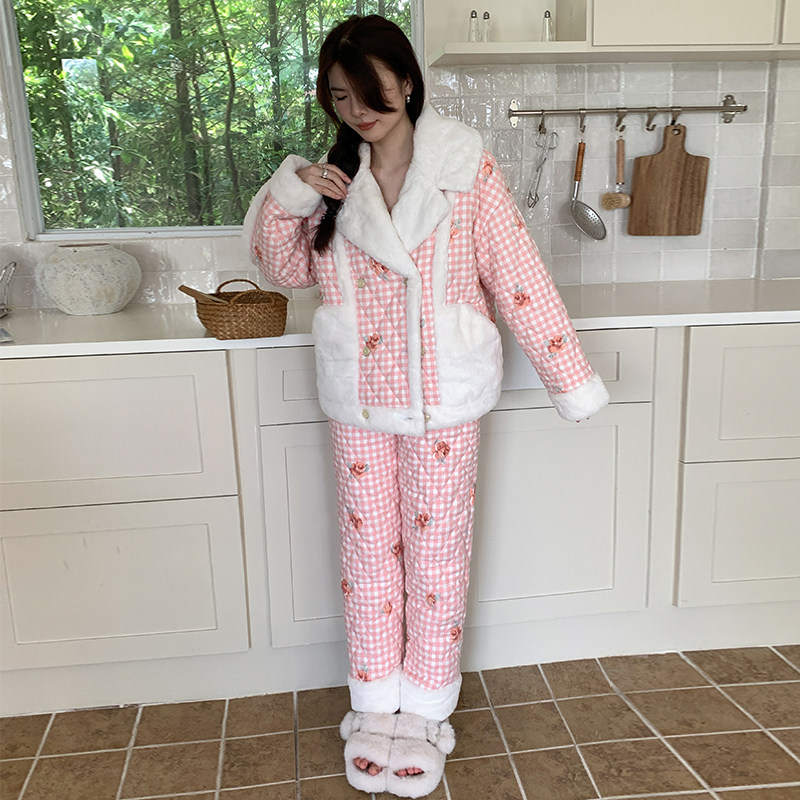 pink grape冬季女士睡衣可外穿三层夹棉加厚珊瑚绒保暖家居服套装