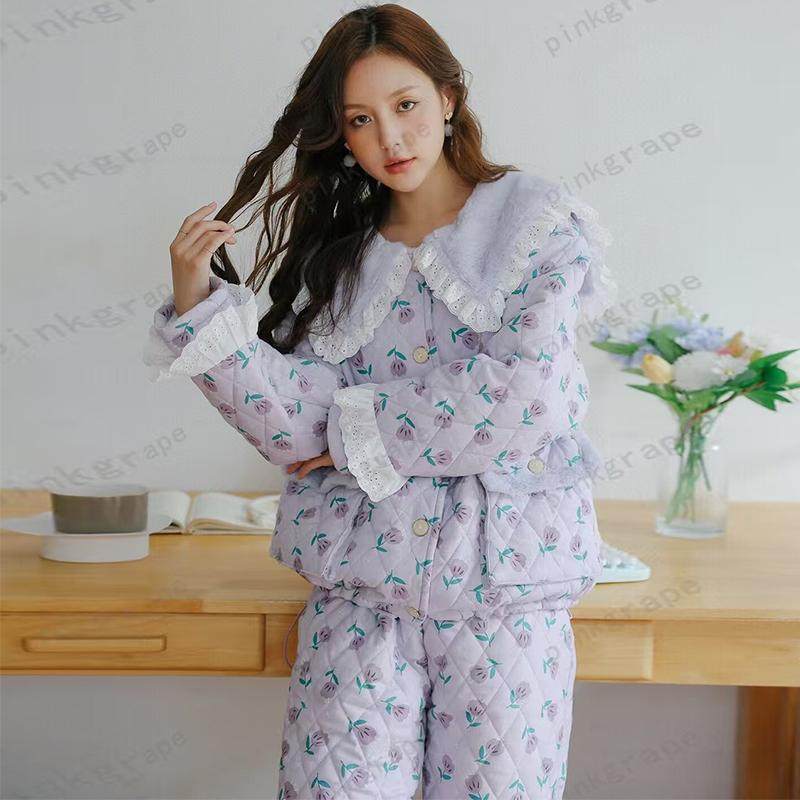 pink grape冬季三层加厚珊瑚绒夹棉睡衣女士保暖加棉冬天家居服女