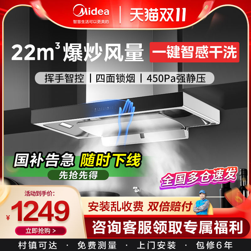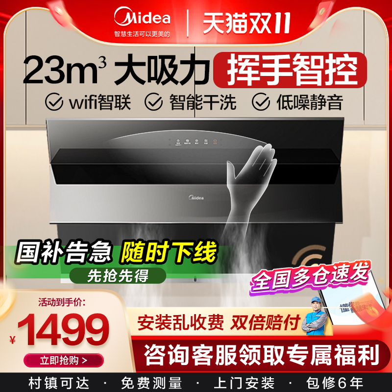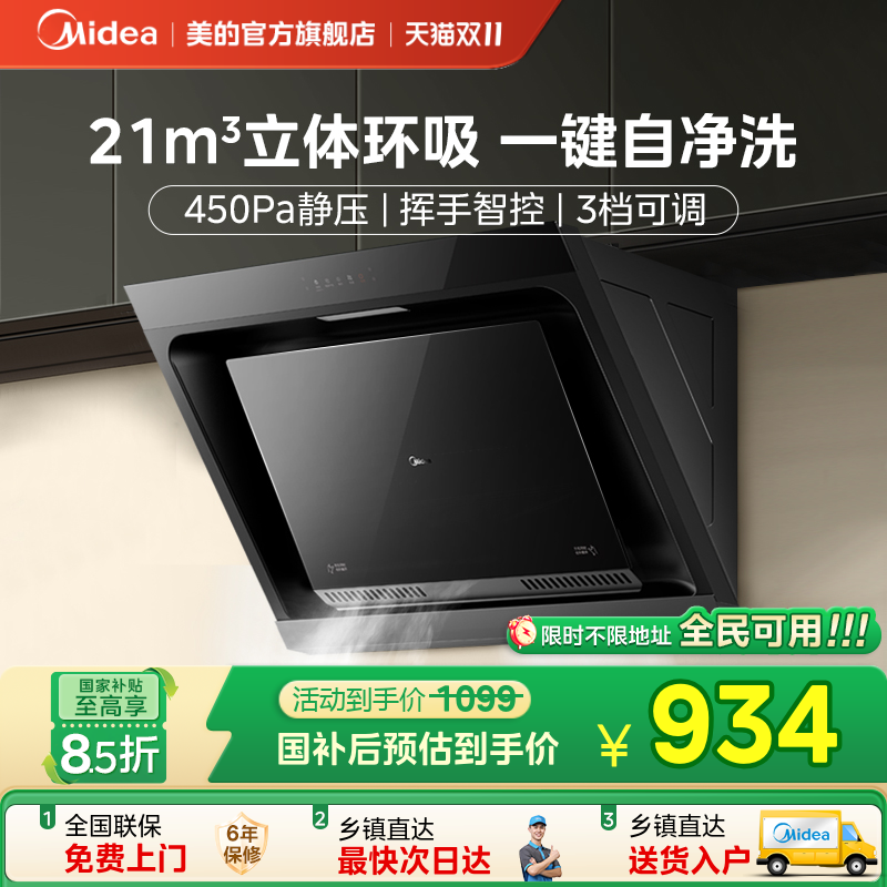 【国家补贴】美的抽油烟机家用厨房22大吸力侧吸式挥手自动清洗