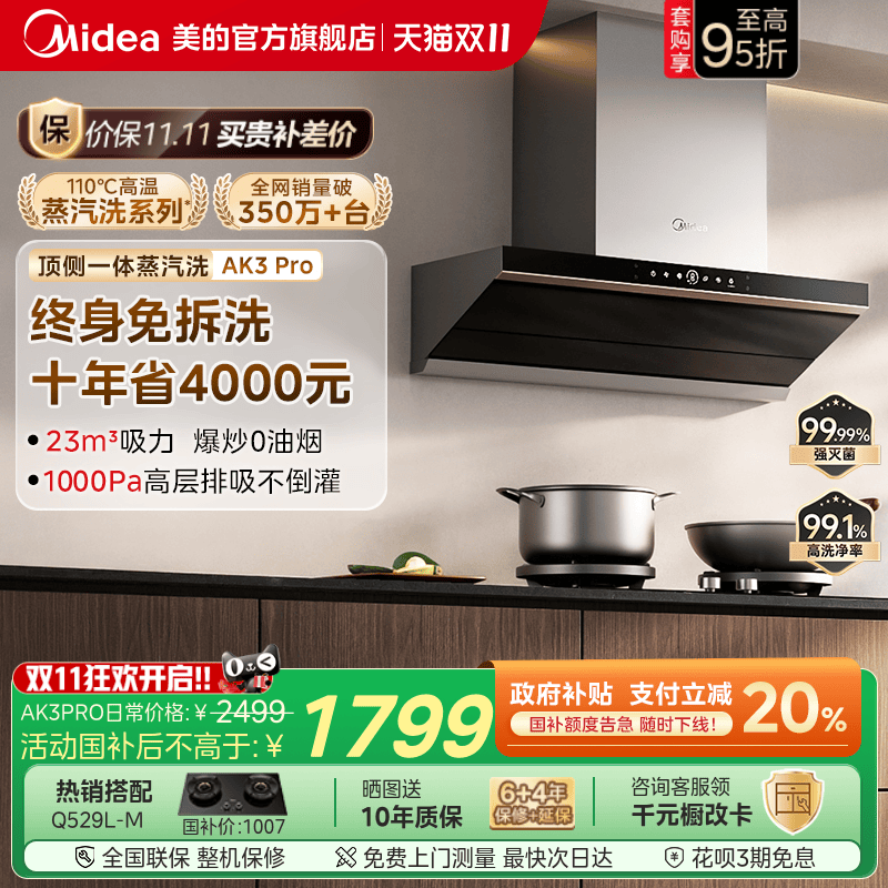 政府补贴美的蒸汽洗AK7Pro家用大吸力厨房脱排抽油烟机AK5PRO官方