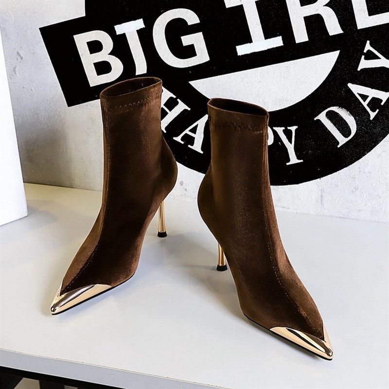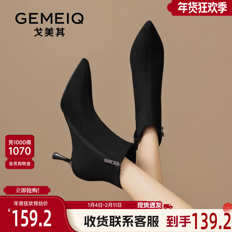 戈美其尖头短靴女高跟袜靴舒适春秋新款单靴细跟绒面弹力瘦瘦靴子