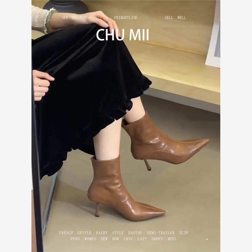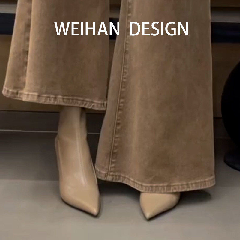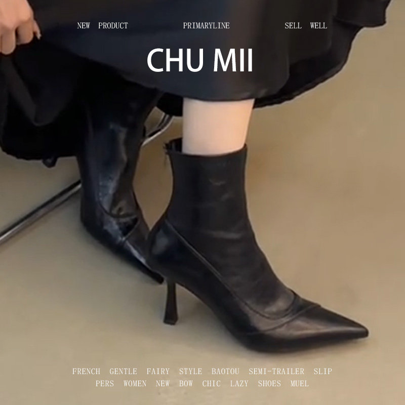 米西家超尖头短靴女高跟鞋女2025秋冬新款欧美风女士细跟拉链踝靴