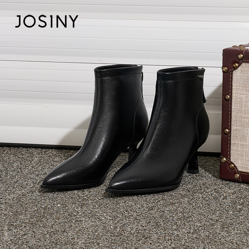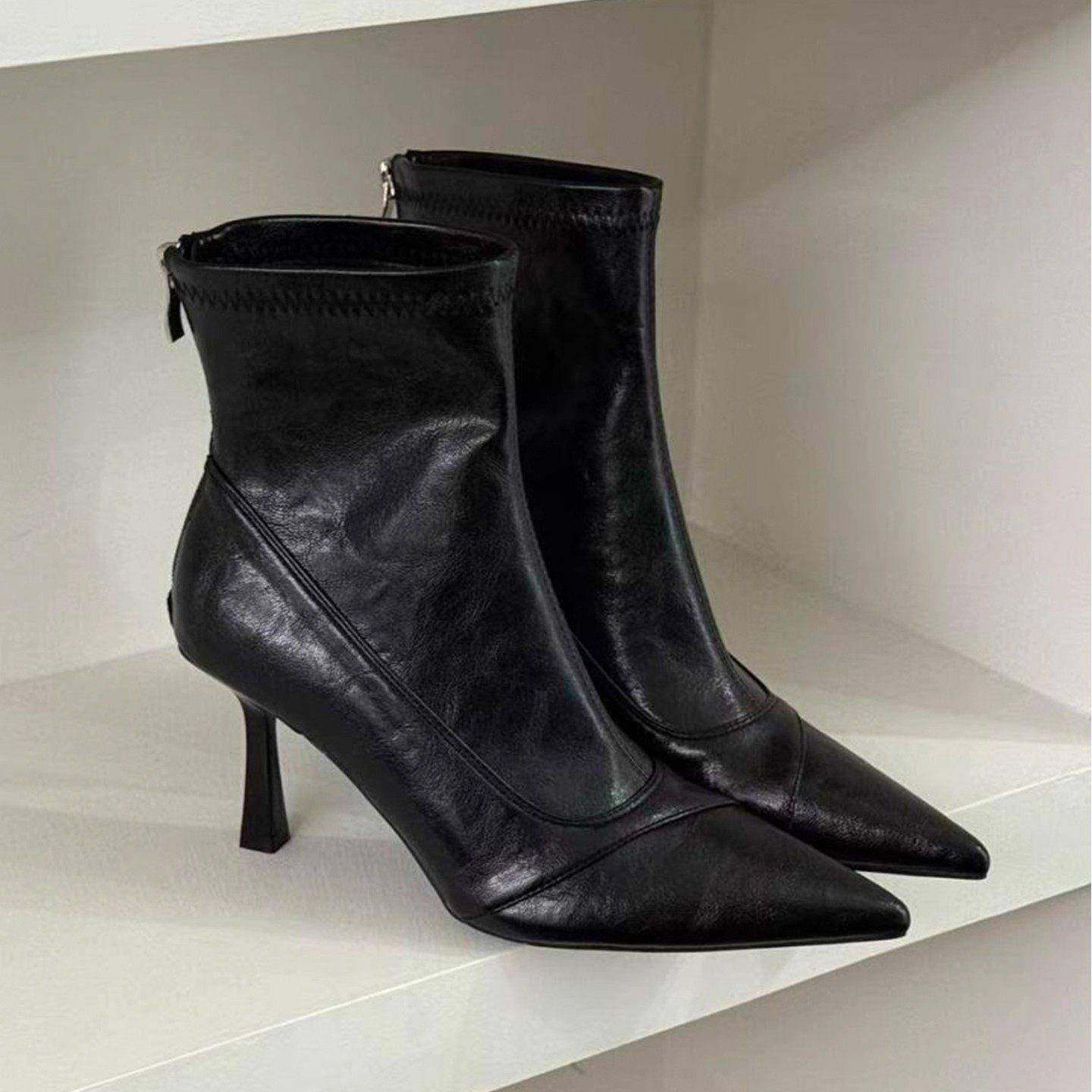 羊皮版!高级感尖头短靴女高跟后拉链瘦瘦靴气质细跟通勤弹力踝靴