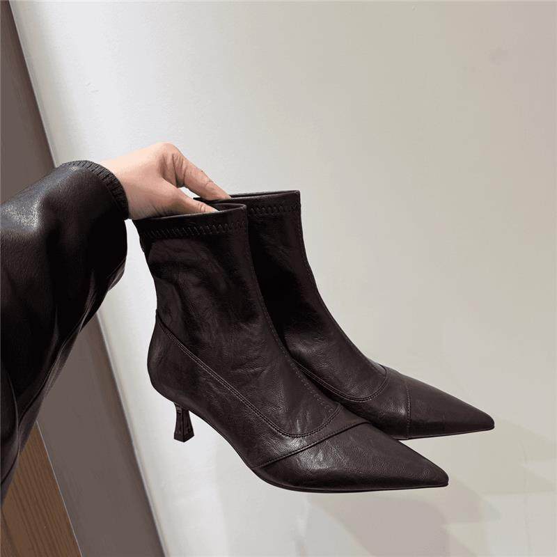 春秋尖头短靴女高跟细跟后拉链棕色2026新款韩版季黑色弹力0121ud