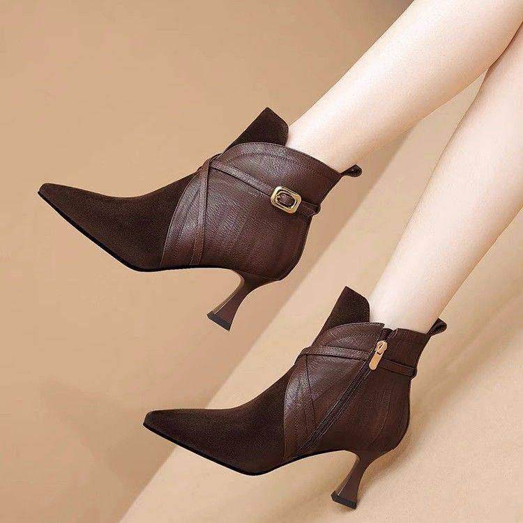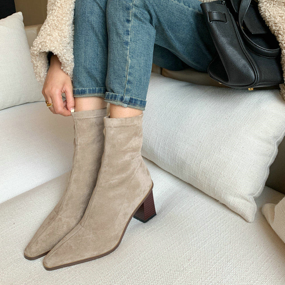 芙号尖头短靴女高跟女士靴法式裸靴瘦瘦靴绒面冬季女鞋简约低筒靴