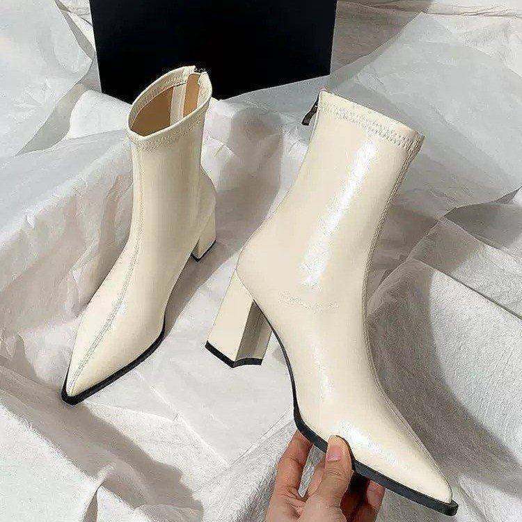 米色尖头短靴女高跟秋冬新款法式小踝靴加绒后拉链粗跟弹力瘦瘦靴