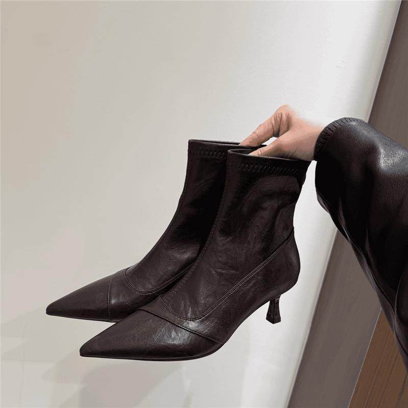 尖头短靴女高跟细跟瘦瘦靴仙女百搭2025年新款马丁靴软皮切尔西靴