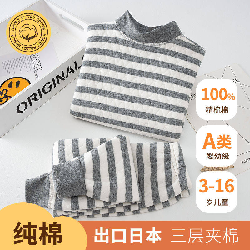 出口外贸纯棉三层夹棉加厚空气棉儿童A类学生保暖内衣套装居家服