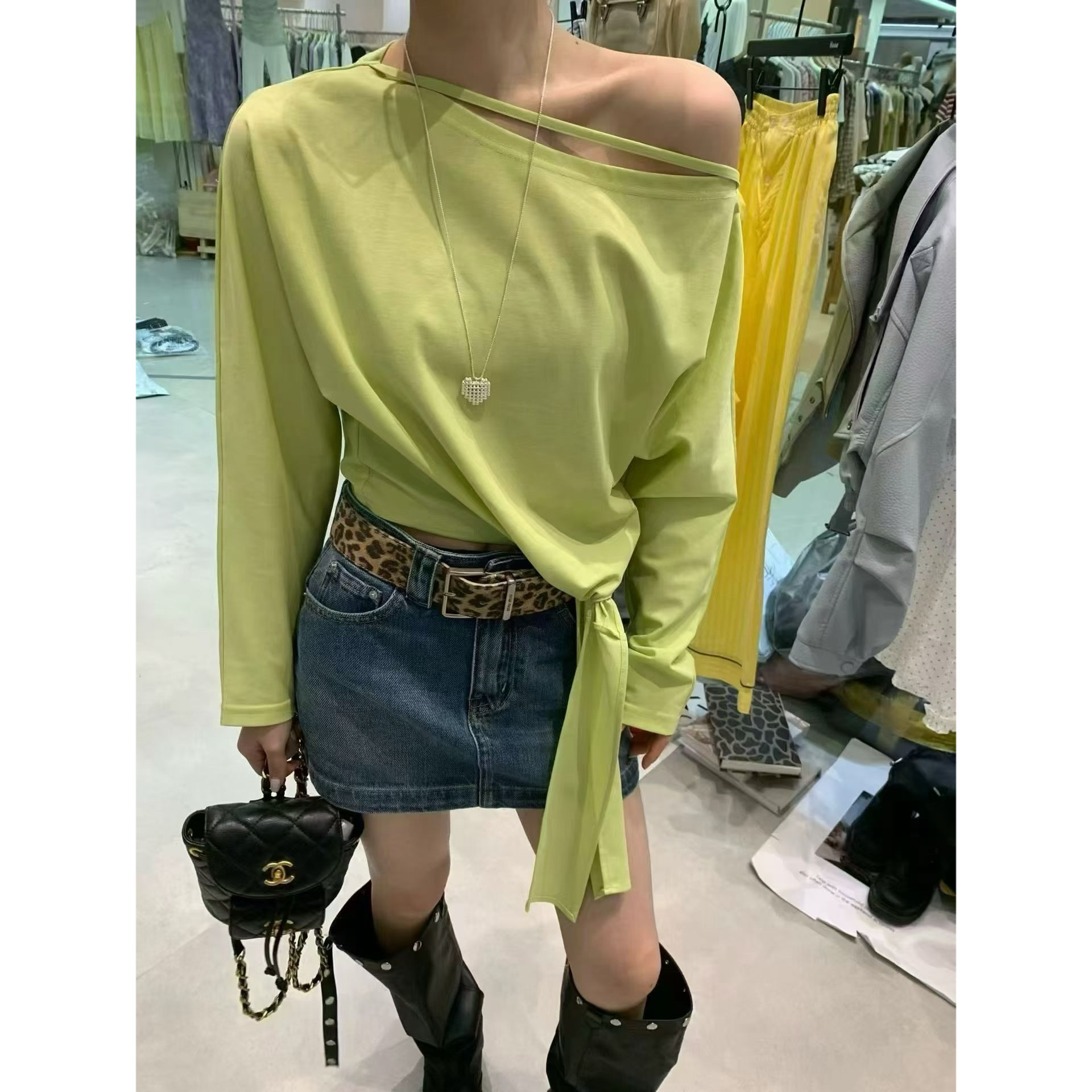 NEVA HU 秋日赴约 斜肩长袖针织t恤女露肩设计感内搭打底衫上衣
