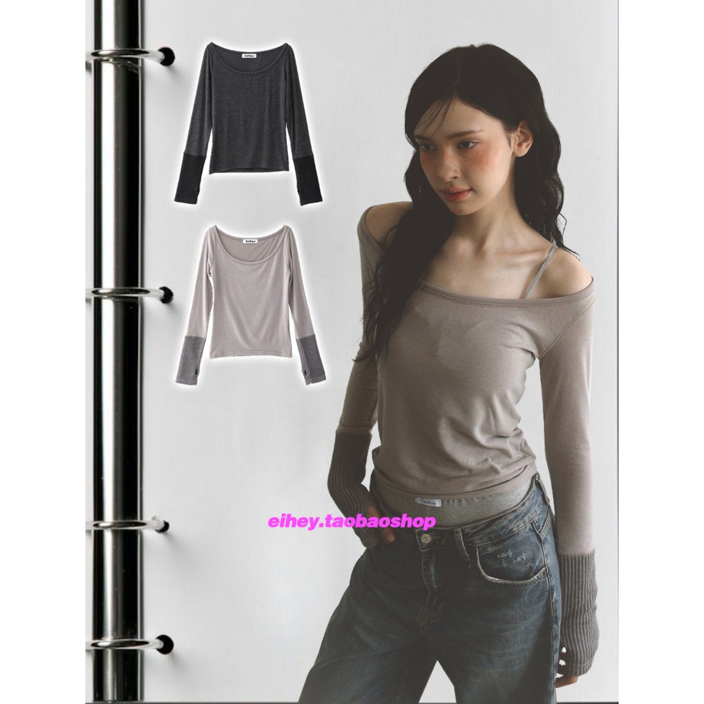 eihey诶嘿韩系百搭纯色拼接露肩套指T恤长袖女修身内搭打底上衣女