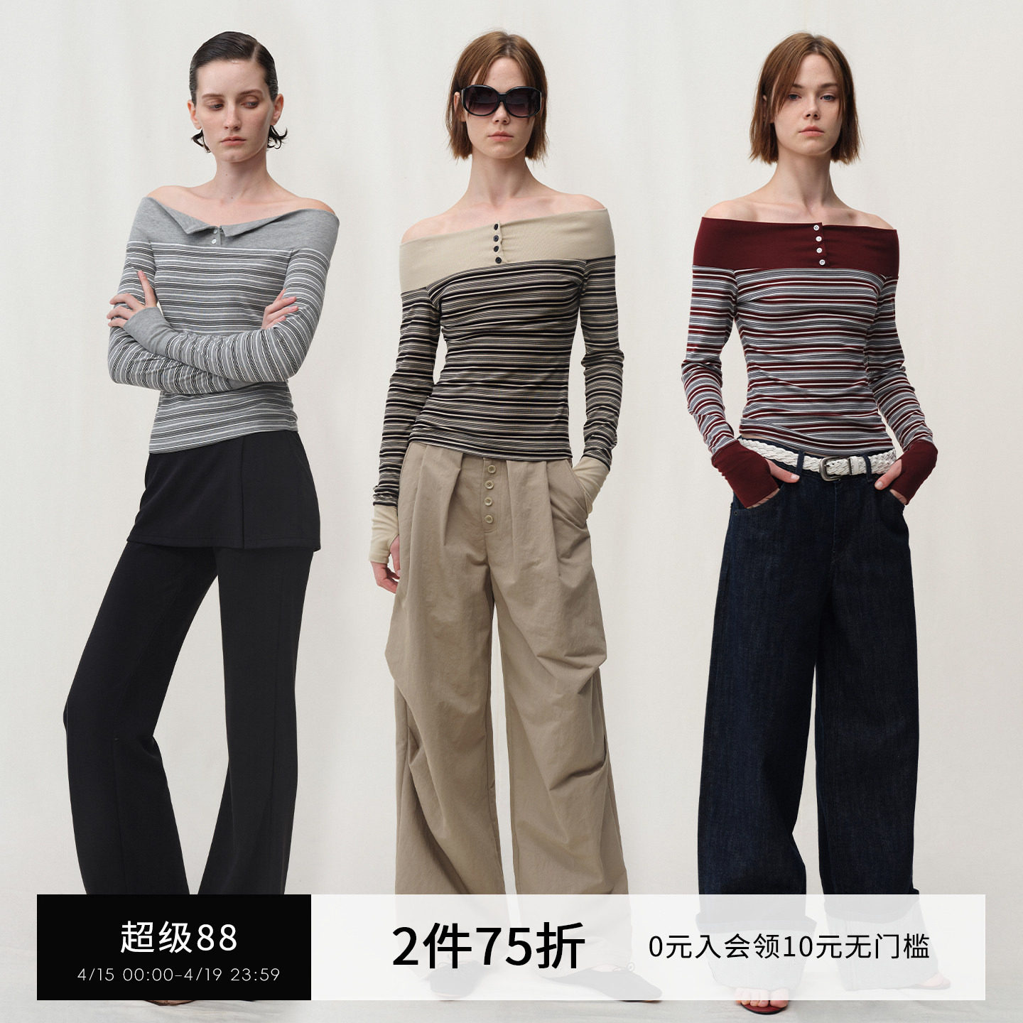 SMIIILE复古条纹拼接一字肩露肩T恤上衣女春设计感打底衫修身显瘦