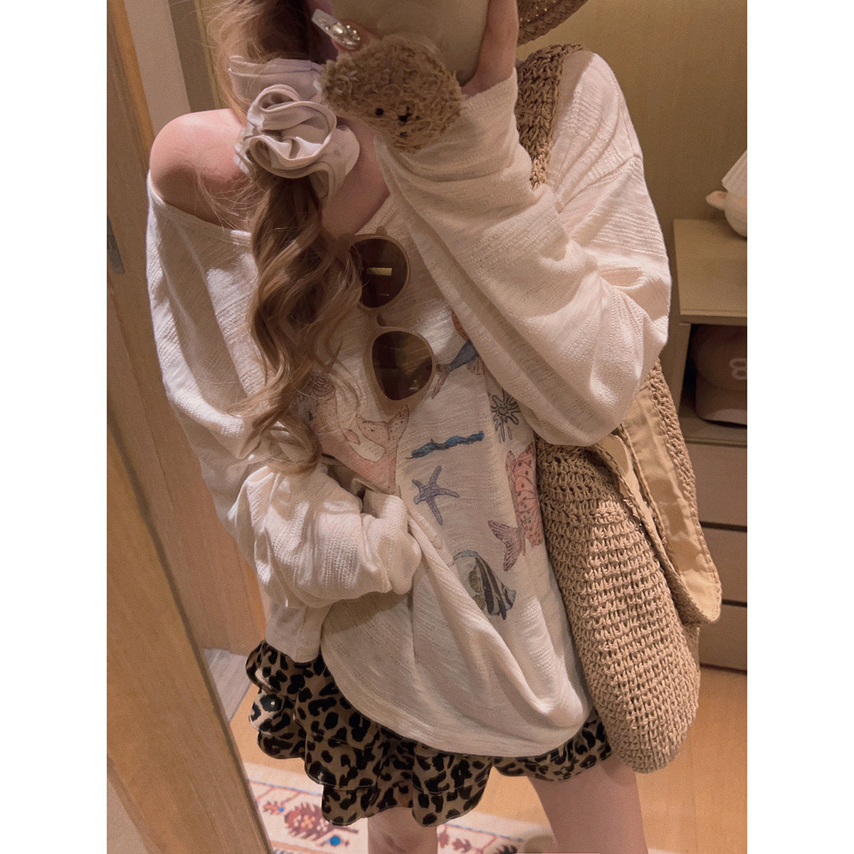 asomesome美式宽松斜肩吊带长袖t恤女2026春款百搭露肩上衣打底衫