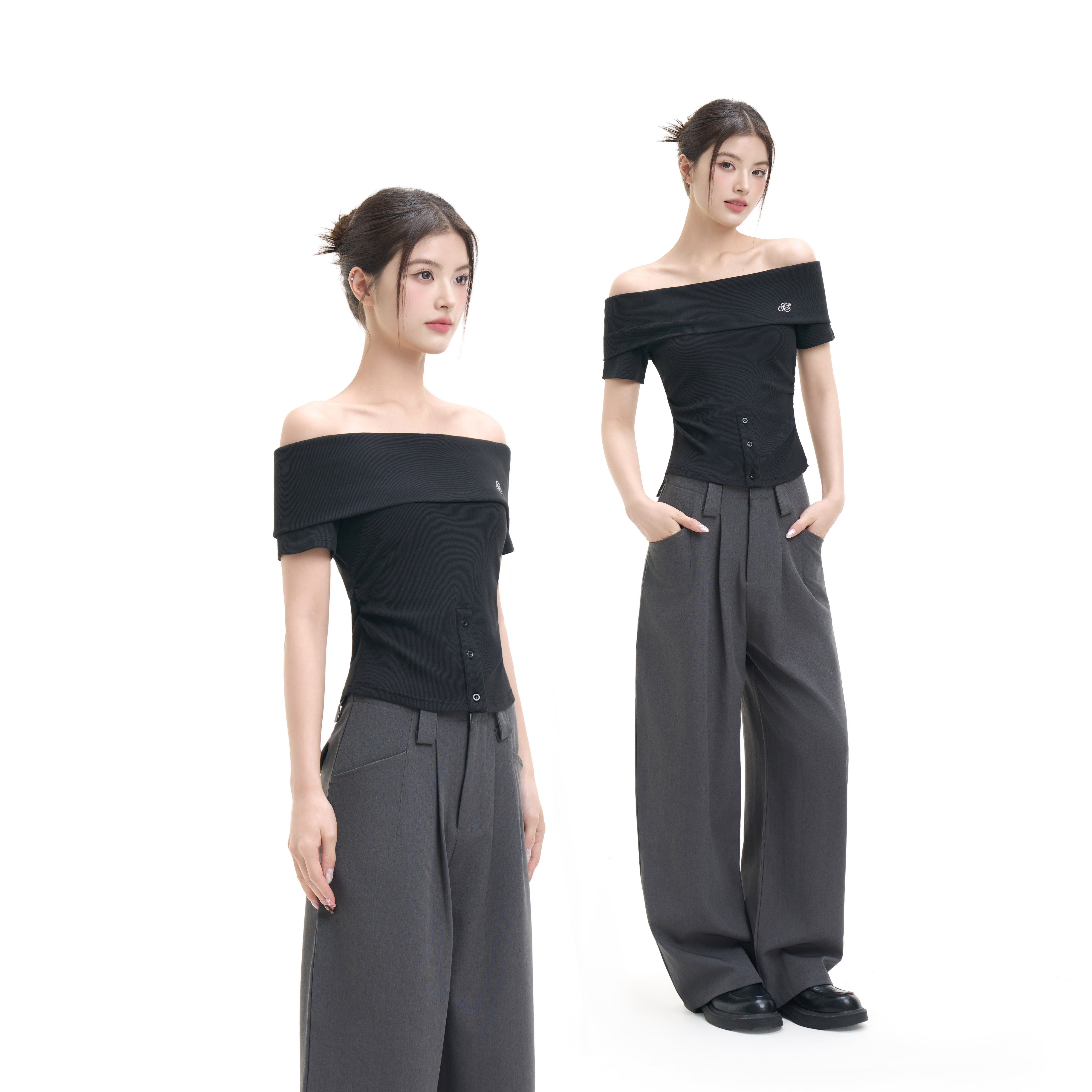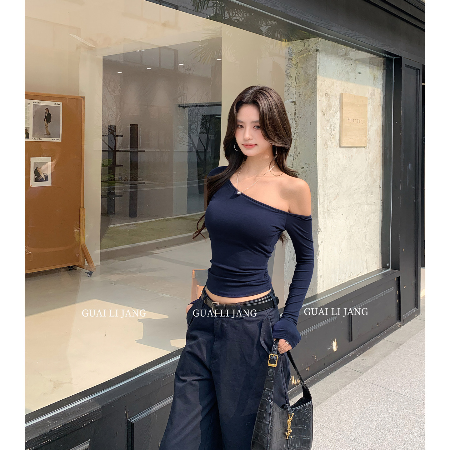 ourhour 斜边下摆 黑色两穿斜领露肩烫钻打底衣 女设计感修身上衣