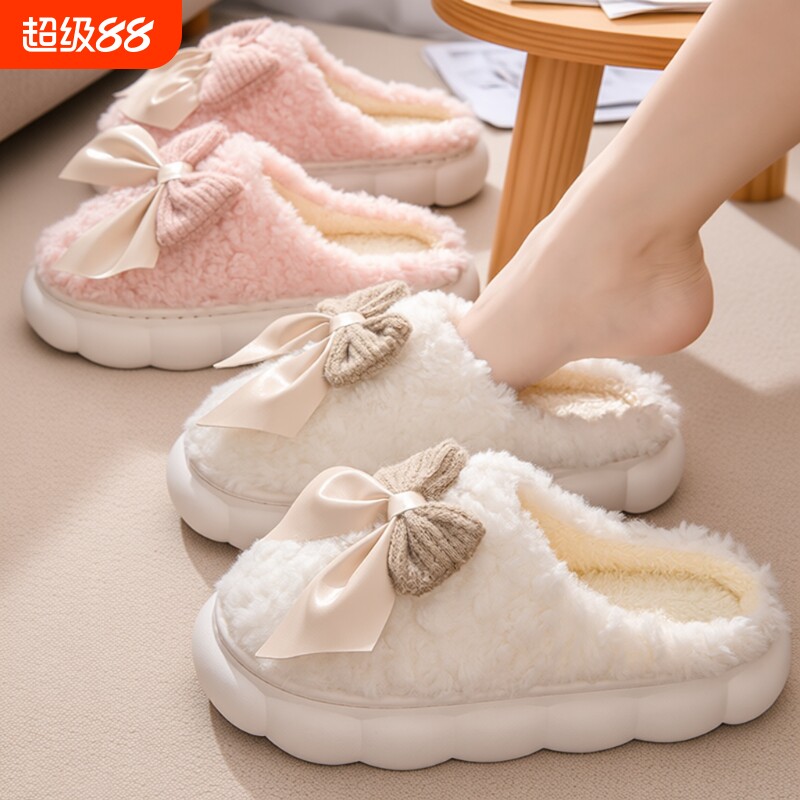 秋冬季蝴蝶结棉拖鞋防滑新款室内家居月子鞋女保暖厚底毛拖男情侣