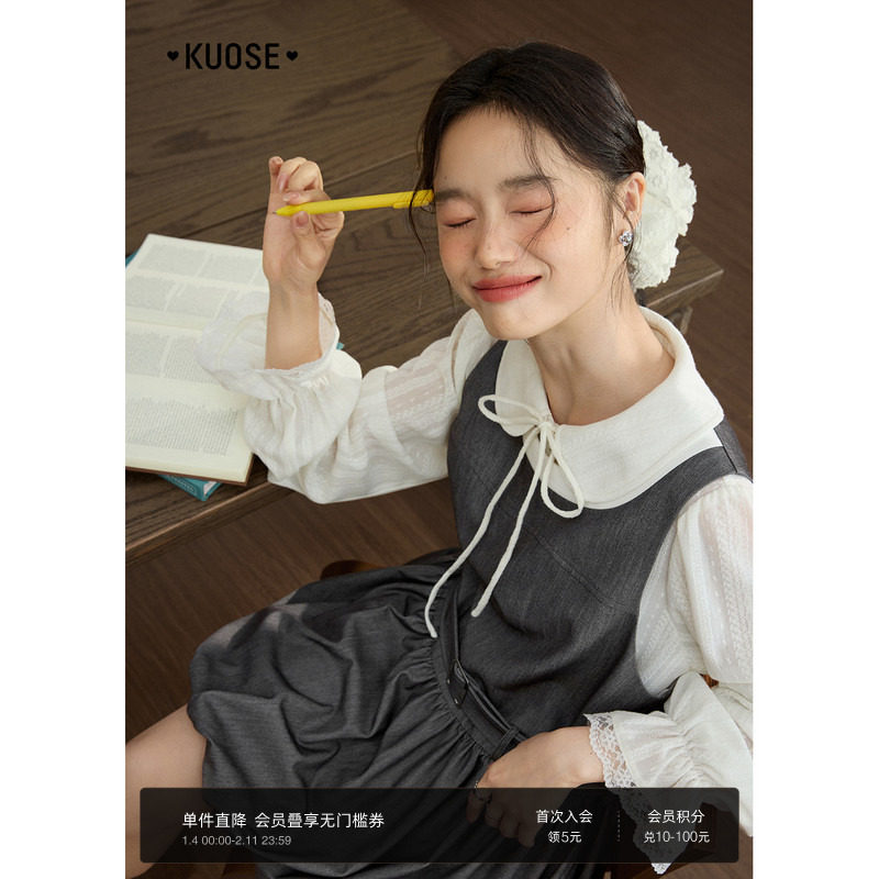 阔色灰色花苞连衣裙内搭蕾丝衬衫两件套装女25秋季新款miu系穿搭
