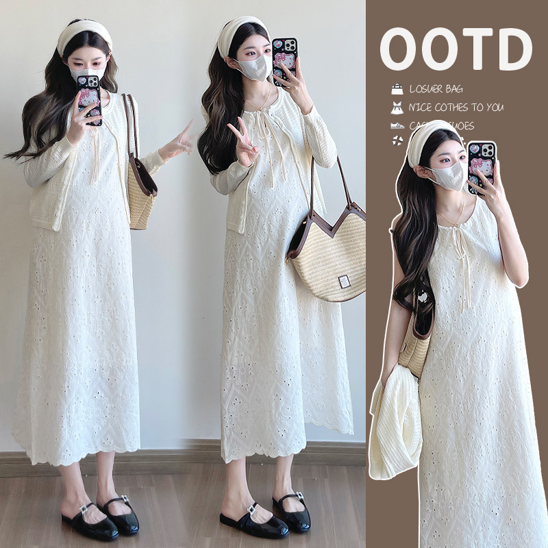 孕妇装秋装长袖开衫上衣秋季蕾丝背心裙两件套连衣裙孕妇套装裙子