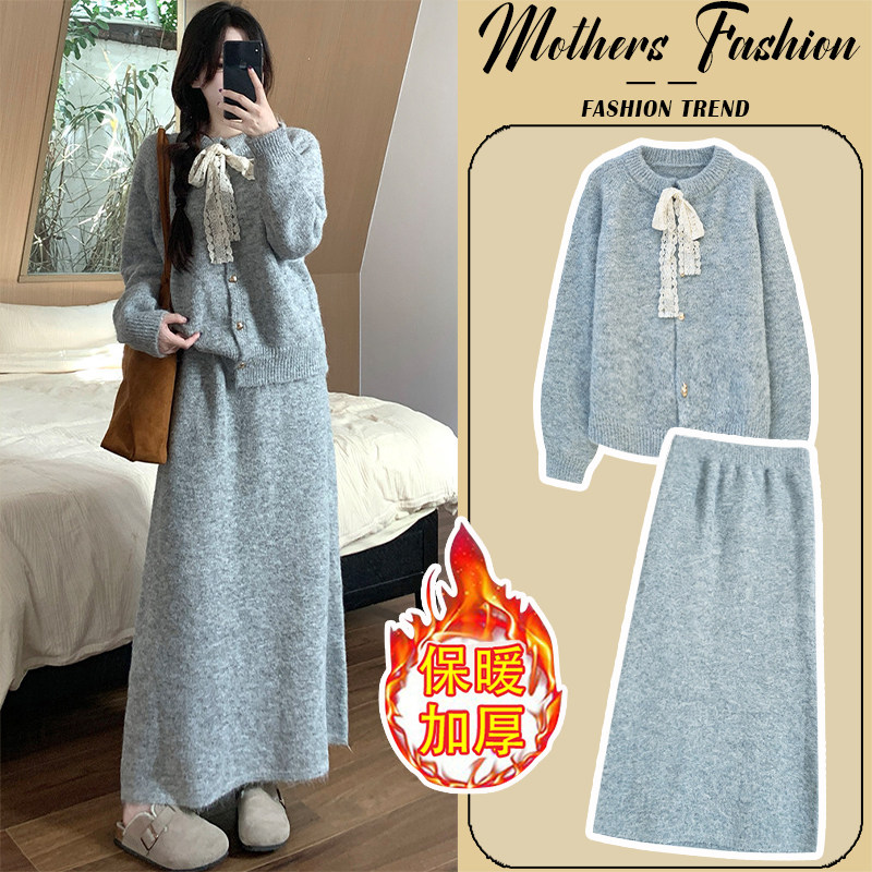 飘带蕾丝连衣裙套装拼接毛衣+半身长裙女秋冬新款胖mm遮肉两件套
