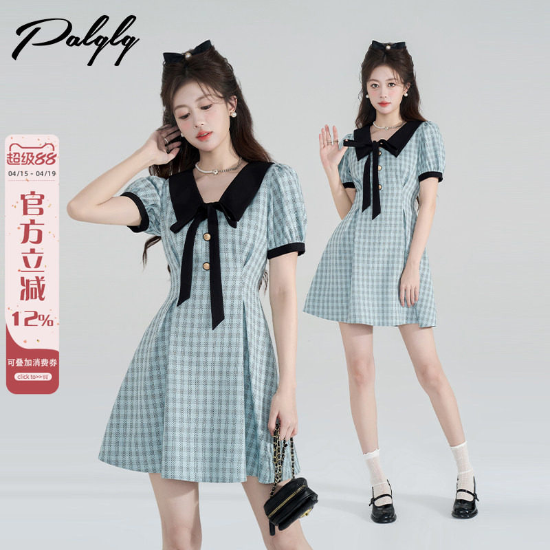 蓝色学院风娃娃领短袖格子连衣裙女夏季甜美设计感气质收腰a字裙