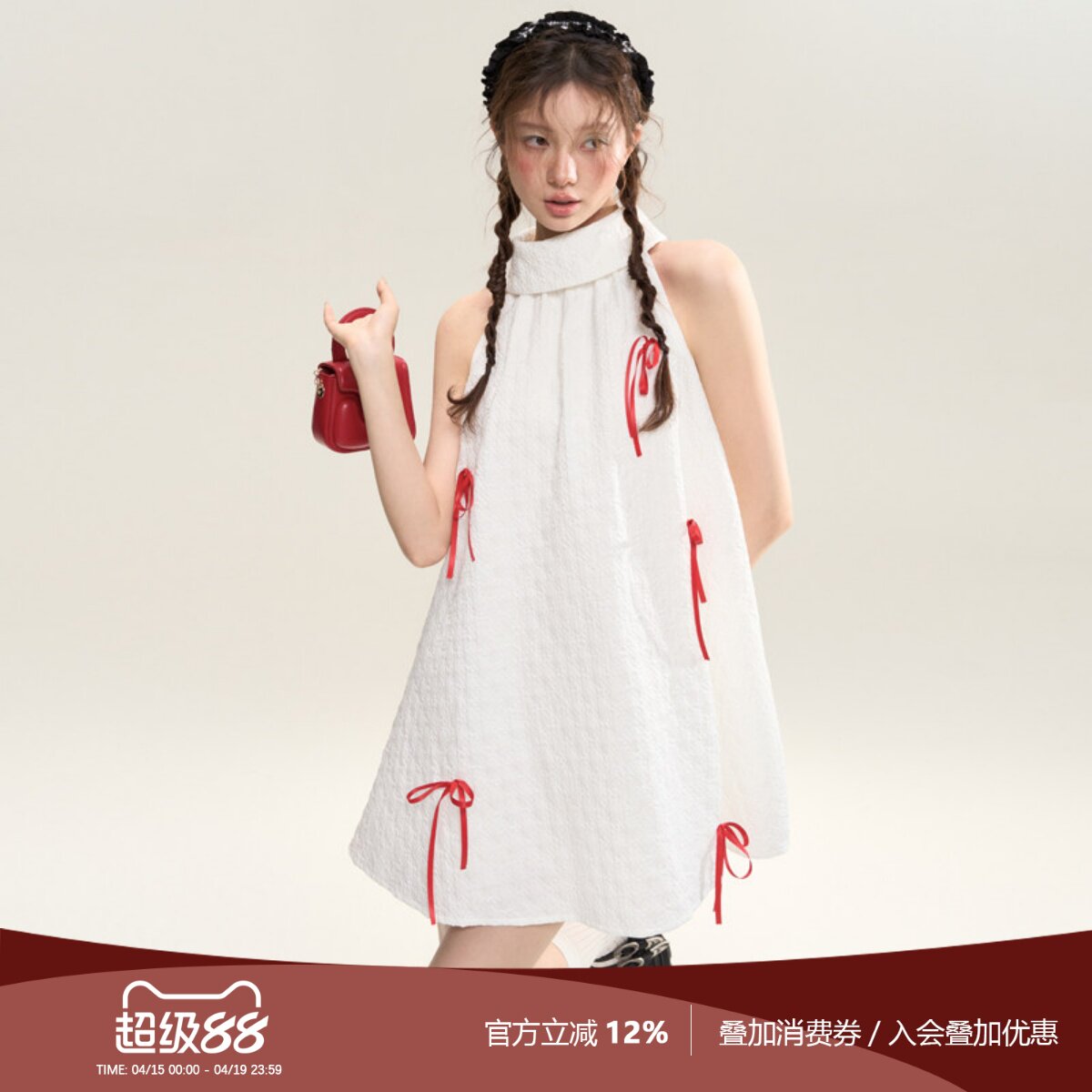 SASSY MOODY 红色立体蝴蝶结连衣裙女宽松显瘦无袖挂脖娃娃裙