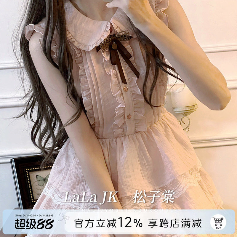 啦啦酱 松子棠 娃娃领粉色小飞袖连衣裙蕾丝边蛋糕裙甜美公主裙女