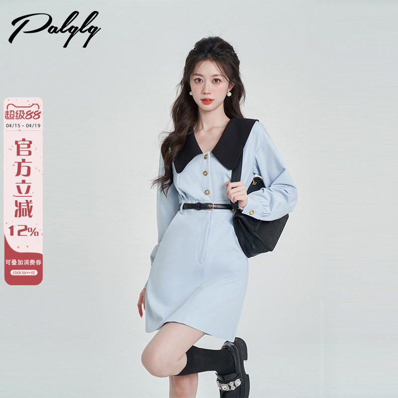 学院风蓝色娃娃领连衣裙女长袖春秋2025新款高级感气质收腰a字裙