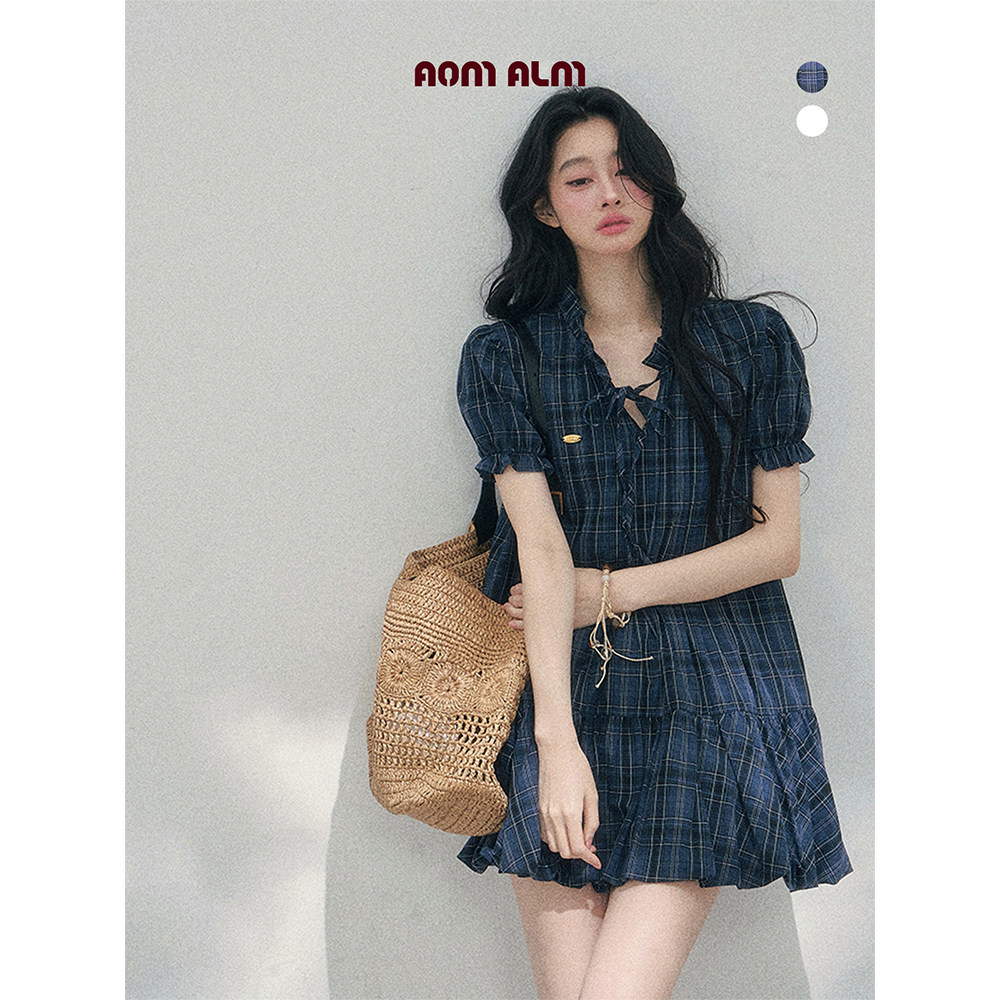 AOMALM少也眼"素裙曳轻褶"%法式格子泡泡袖连衣裙女春娃娃裙短裙