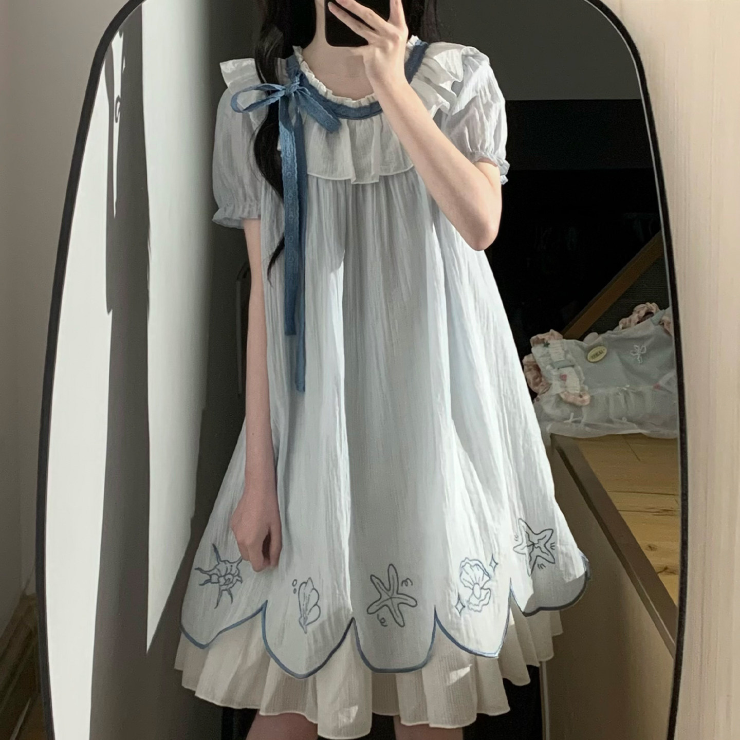 东京岁时记jk原创夏季蓝色刺绣短袖娃娃裙少女甜美花边减龄连衣裙
