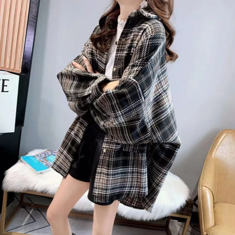 毛呢外套复古磨毛格子衬衫女上衣冬外穿百搭大码衬衣长袖呢子大衣