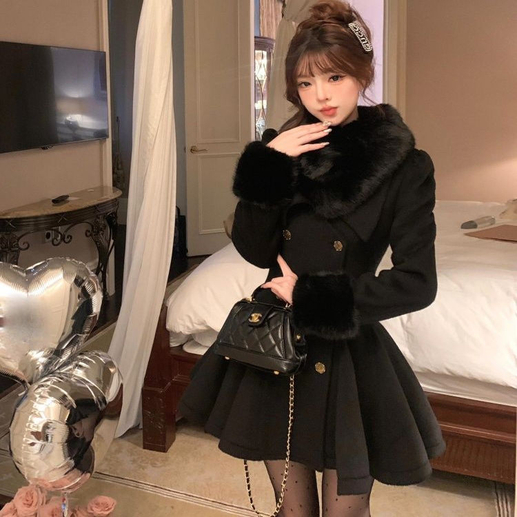 大码胖mm掐腰夹棉冬季毛呢大衣富家千金加厚毛领呢子修身长袖外套