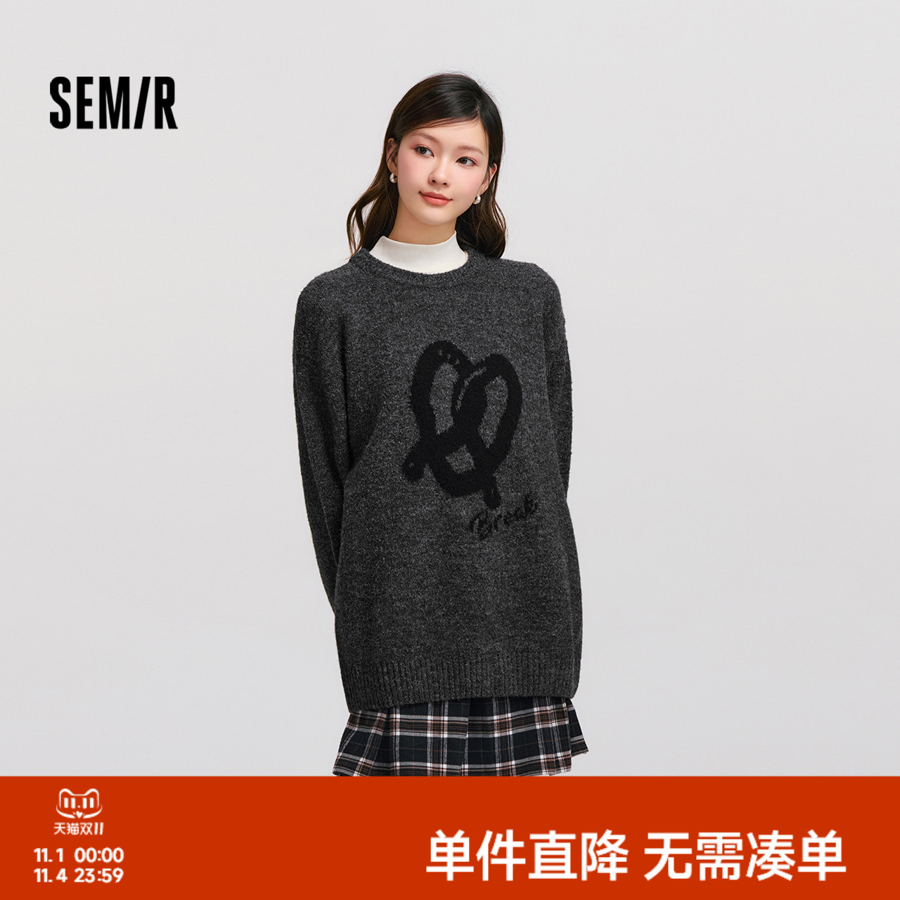 森马毛衣女中长款宽松落肩圆领毛衫休闲慵懒2024新款冬季提花衣服