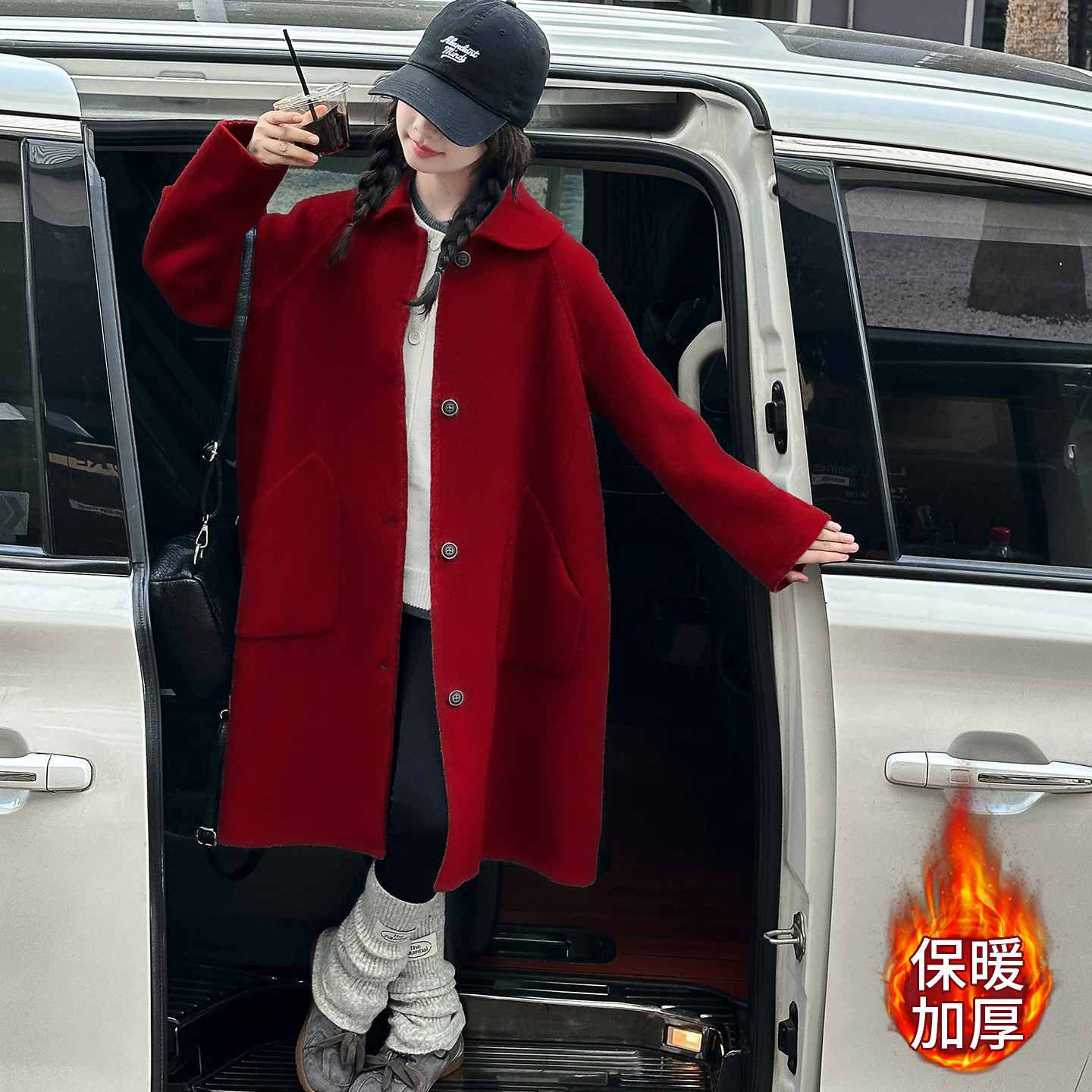 大小卷女童毛呢外套冬装2025新款加厚保暖红色小女孩新年呢子大衣