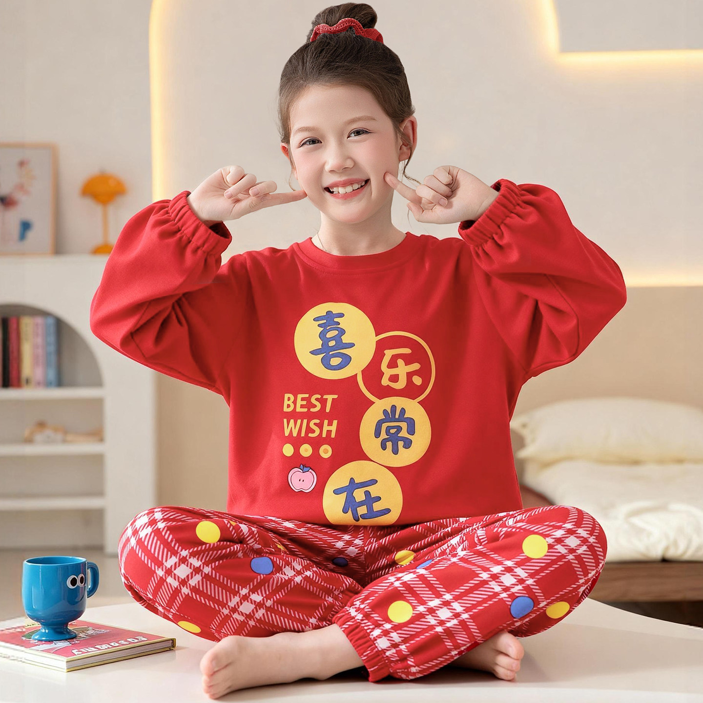 女童纯棉睡衣2026新款小女孩套装长袖儿童红色本命年中大童家居服