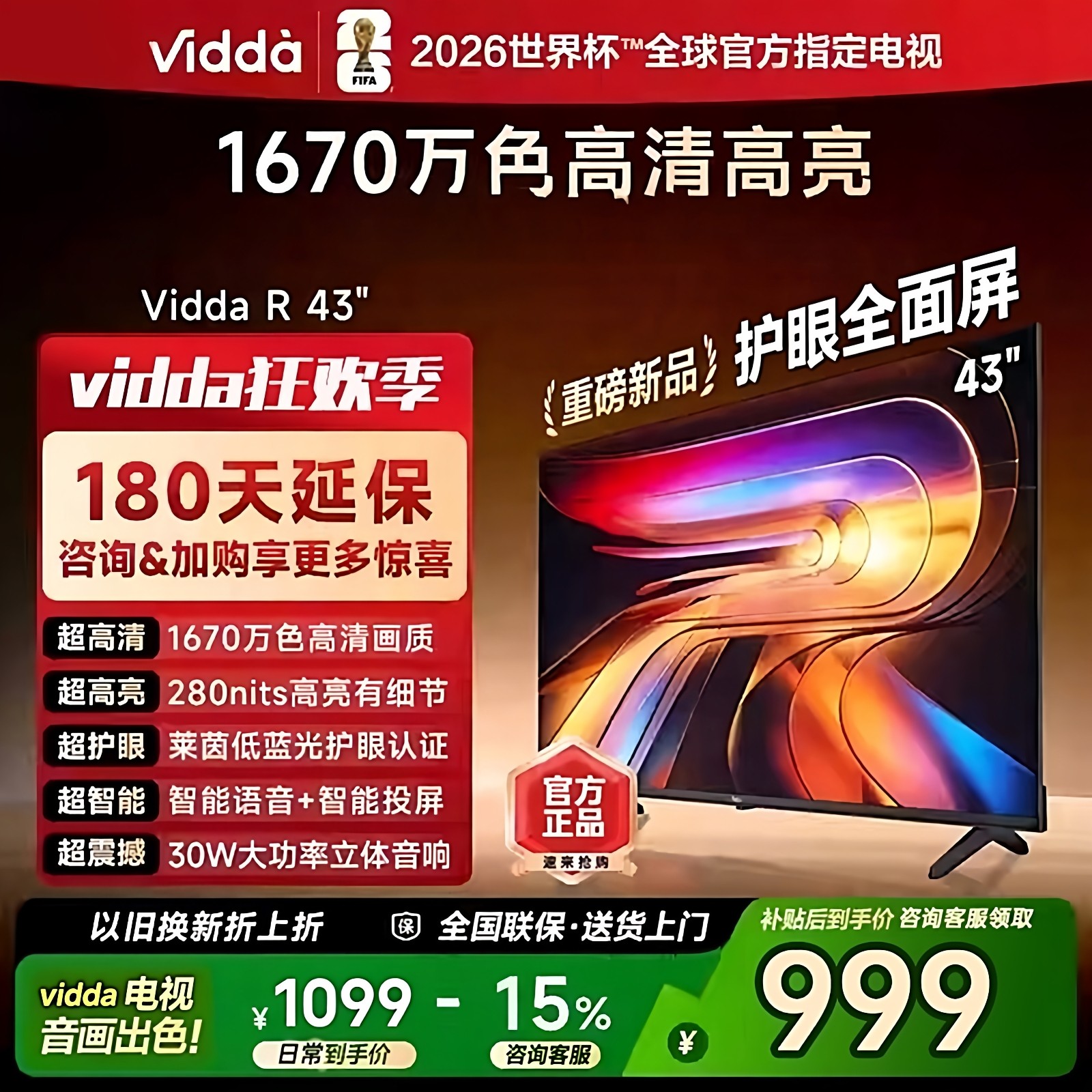 海信Vidda R43 家用护眼款 43吋液晶网络投屏手机遥控电视43VR1Q