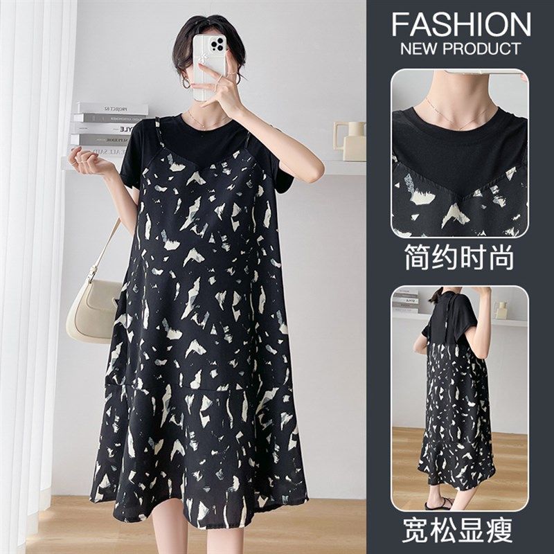 孕妇夏装新款时尚气质花色假两件雪纺裙夏季潮妈夏天中长款连衣裙
