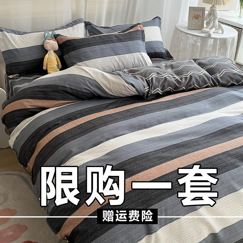 简约北欧日系全棉水洗棉细条灰100纯棉四件套男生耐脏学生宿舍1.8