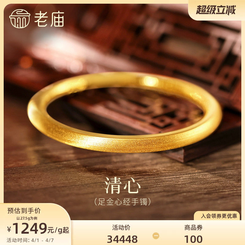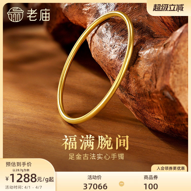 老庙黄金足金999古韵古法实心固口圆条金刚镯素圈手镯送礼物官方