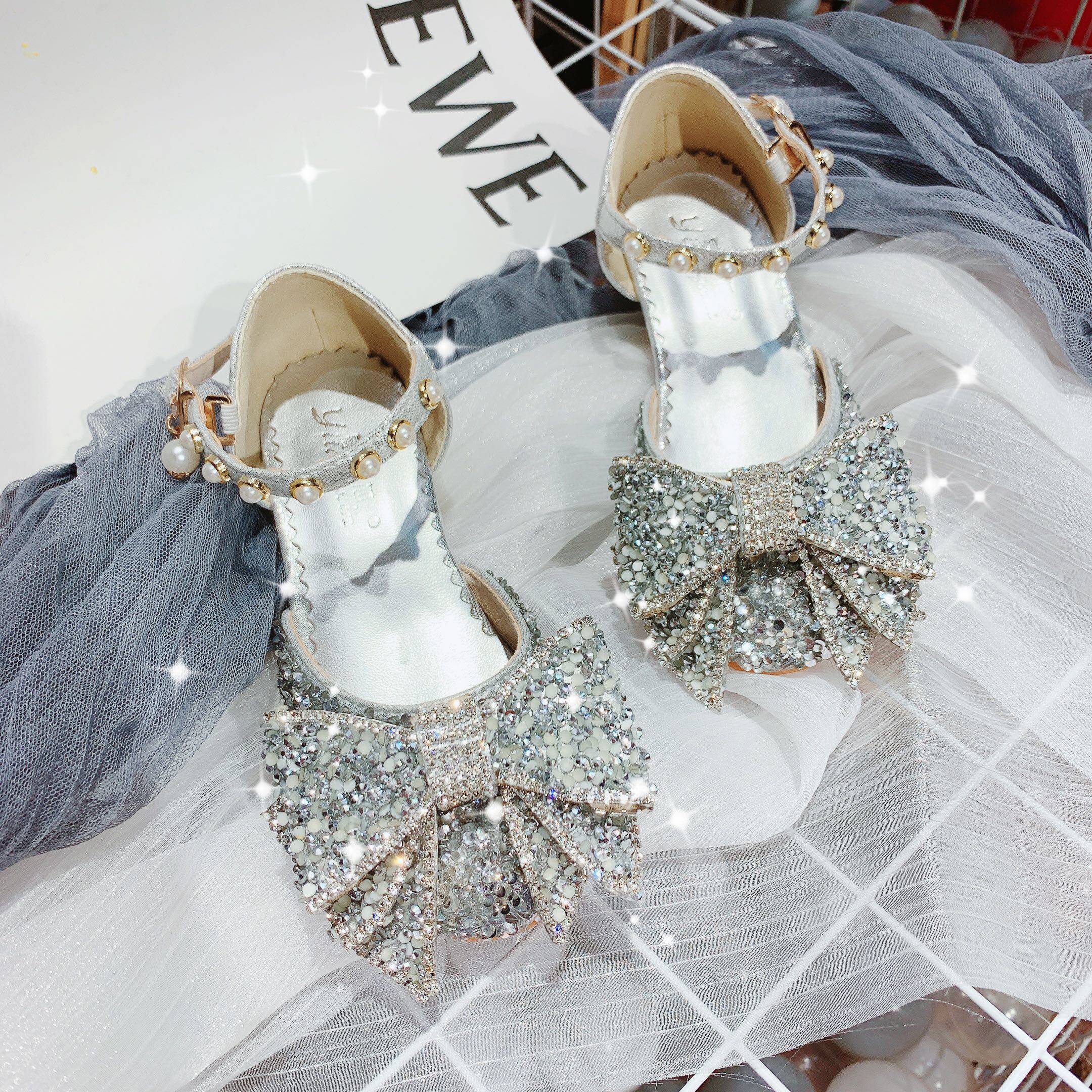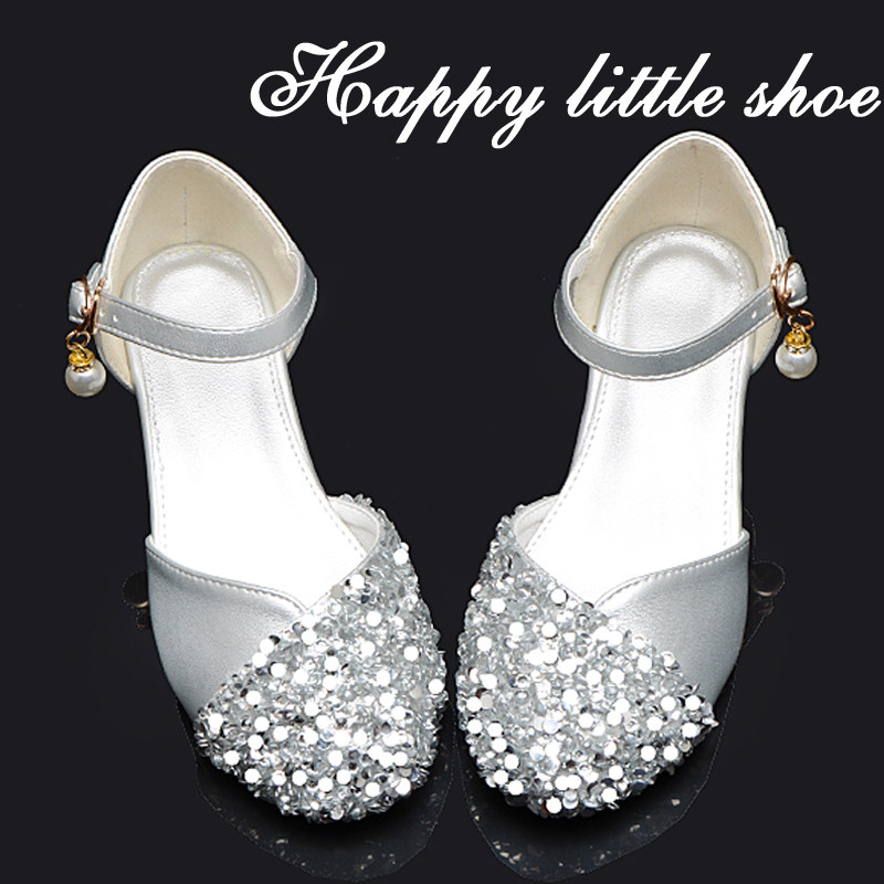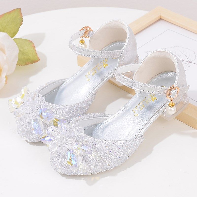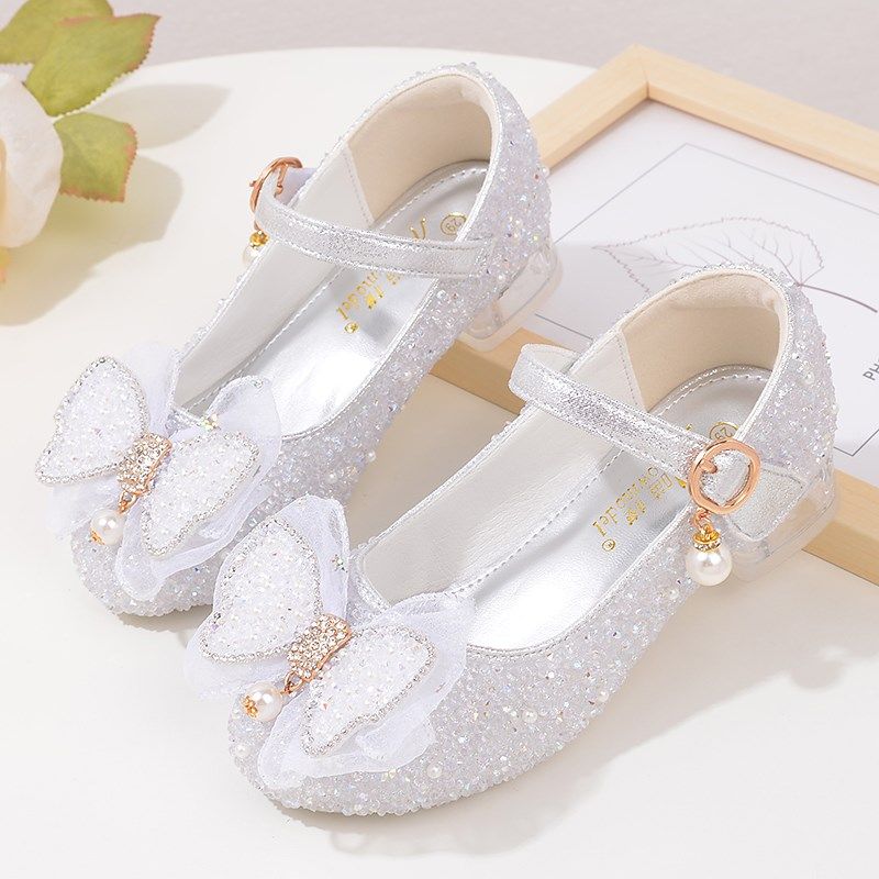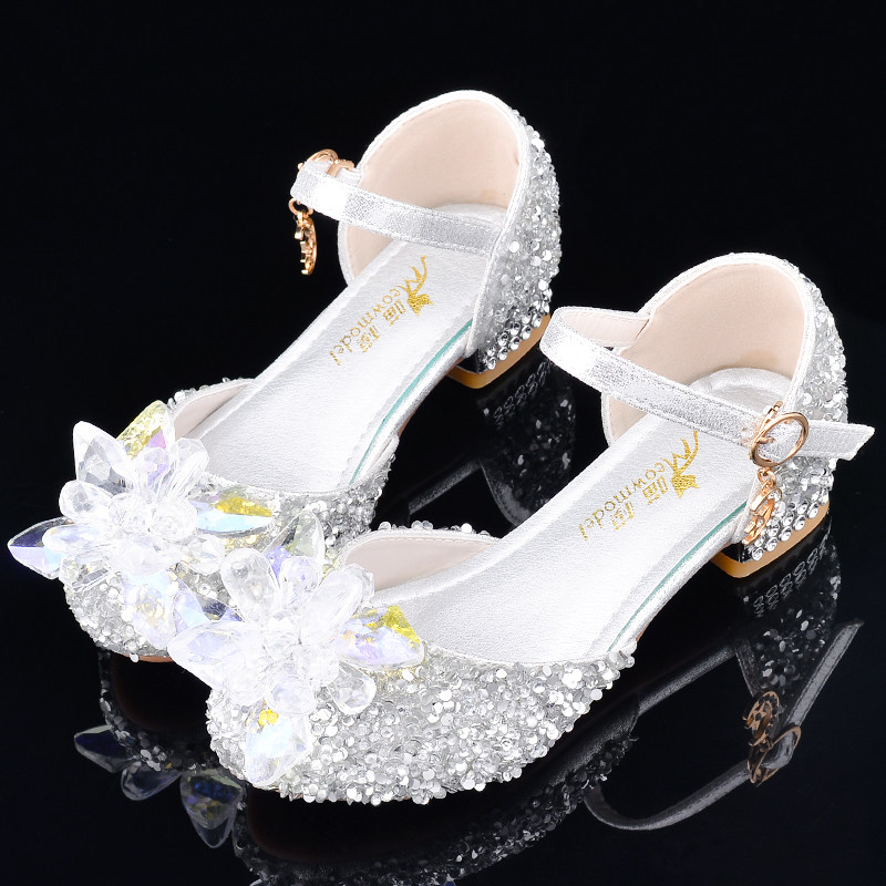 春秋季儿童公主鞋新款女童皮鞋银白色小学生舞蹈表演鞋水晶鞋高跟