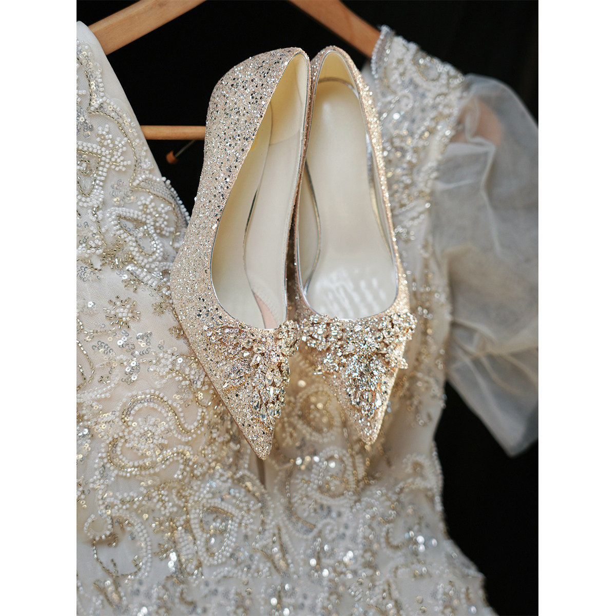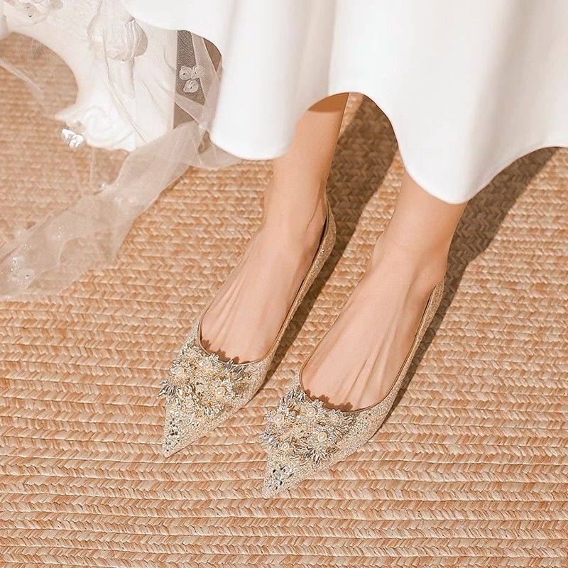 婚鞋女2024年新款主婚纱新娘鞋亮片香槟色水晶鞋尖头细跟高跟鞋女