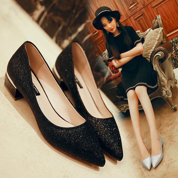 黑色亮片水晶鞋高跟鞋女低跟3cm银色伴娘鞋婚鞋粗跟学生晚会单鞋l