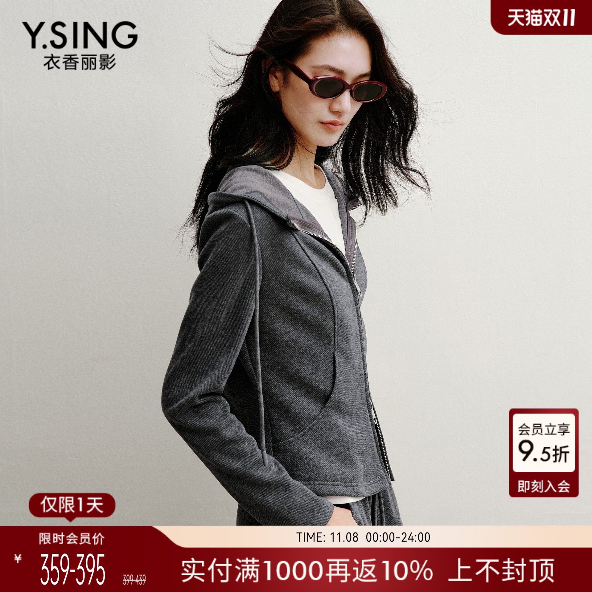 衣香丽影灰色高级感连帽短外套女2025冬装新款时尚双拉链真丝上衣