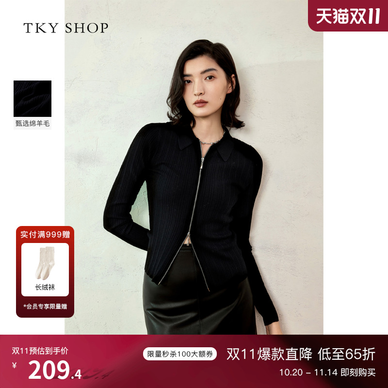 TKY SHOP双拉链修身针织开衫女2025春季新款百搭显瘦羊毛真丝上衣