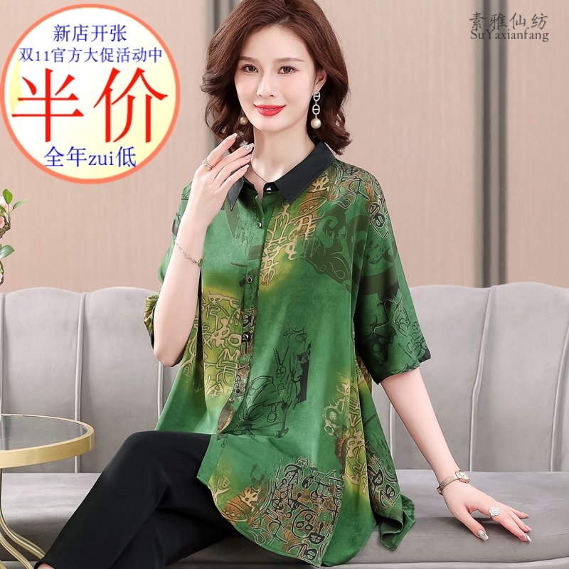 中老年妈妈真丝上衣夏季新款中袖碎花加肥加大丝滑透气桑蚕丝小衫
