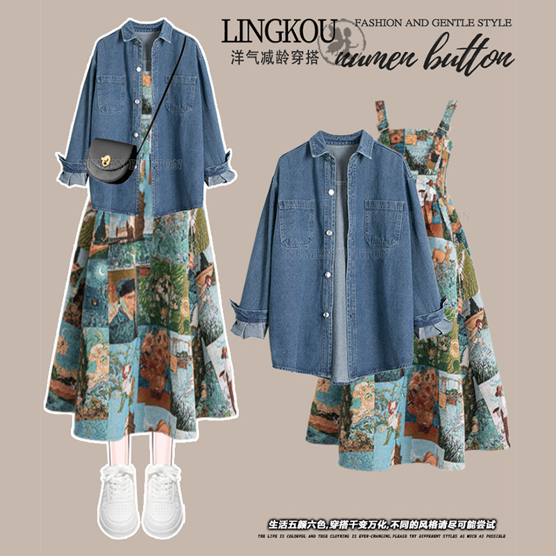 大码女春装今年流行漂亮套装裙胖mm显瘦牛仔外套油画连衣裙两件套