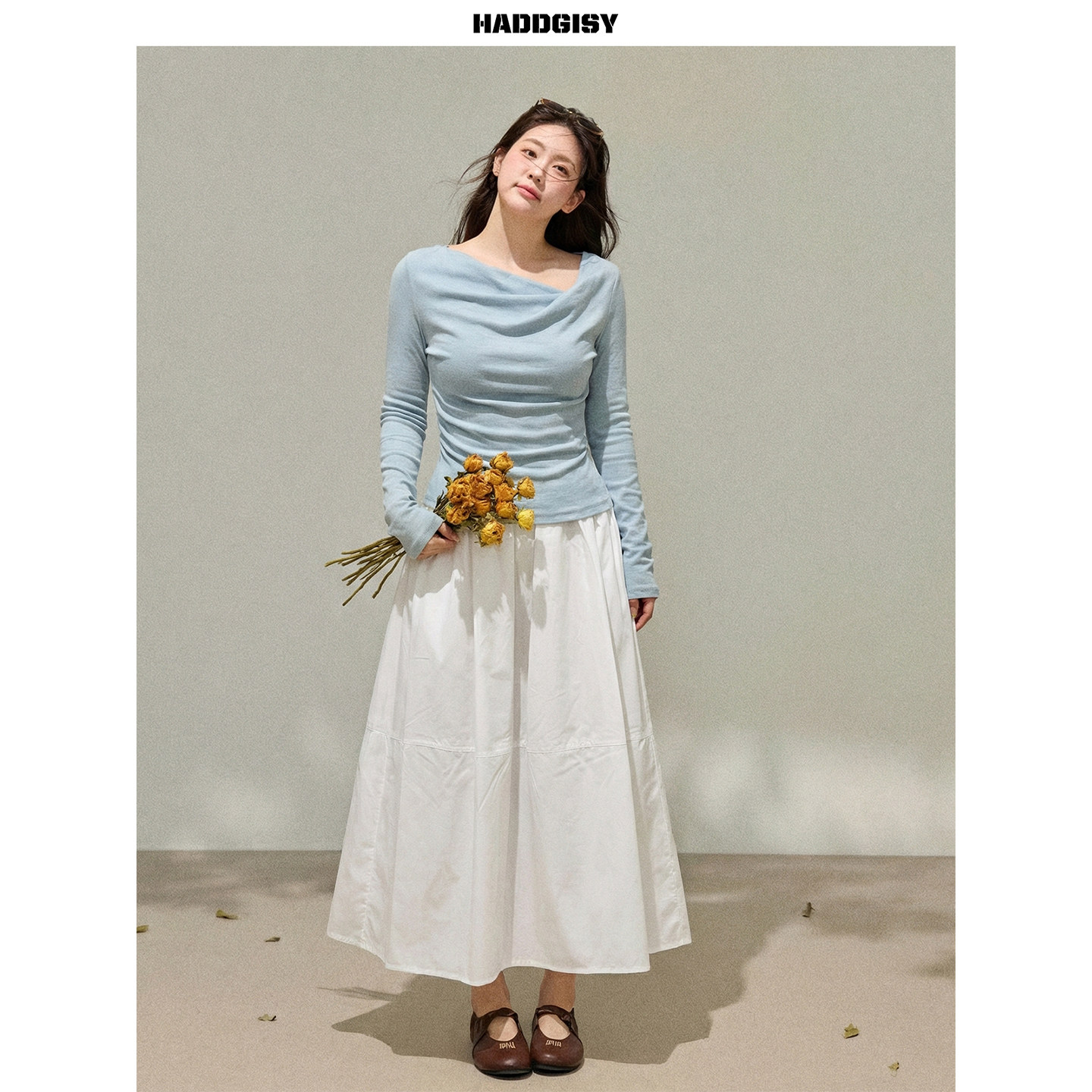 曾小咸大码女装"惬意时光"蓝色荡领长袖上衣春季修身半裙套装胖mm