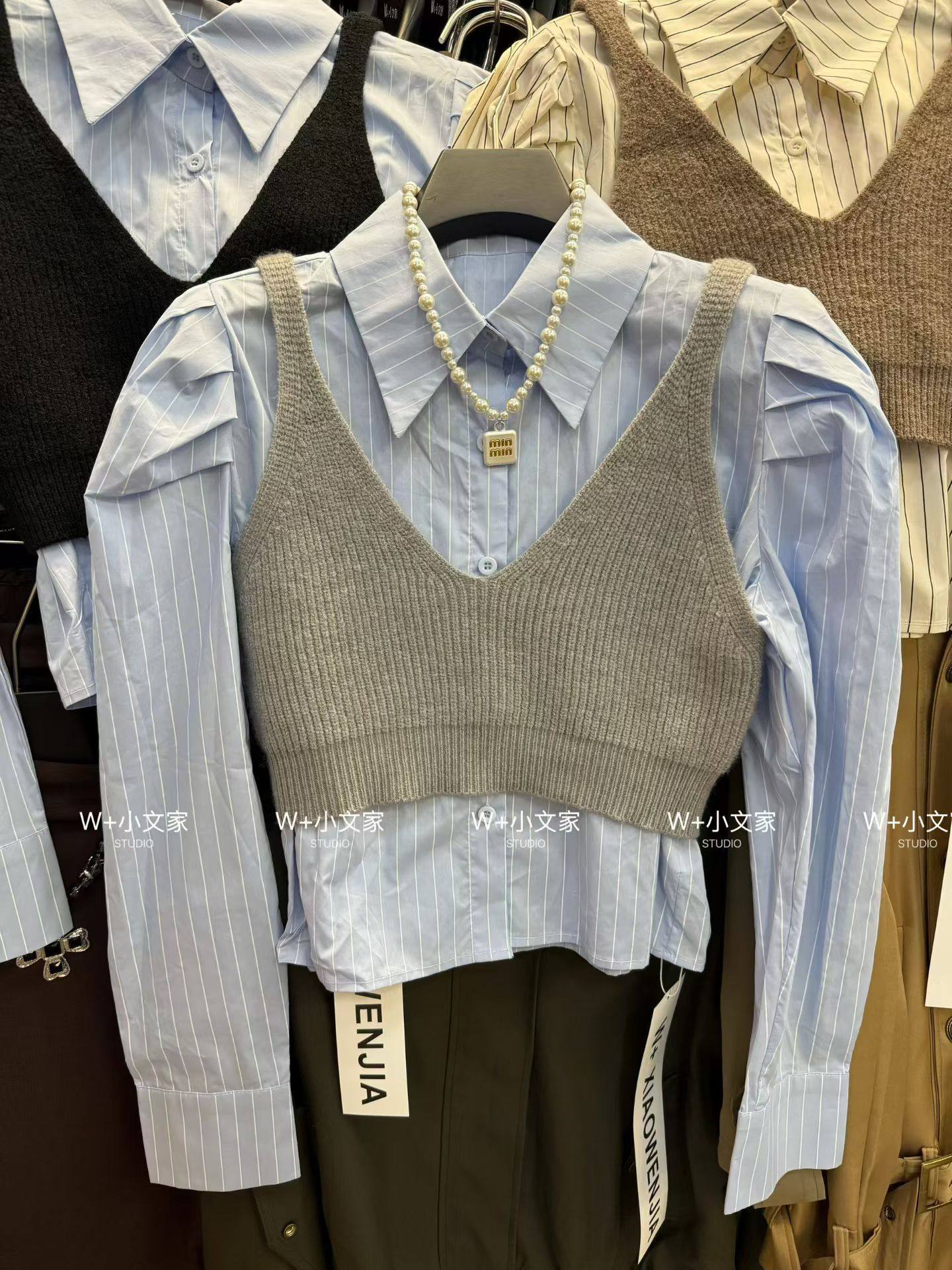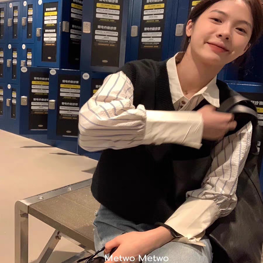 韩国东大门2026春款韩系减龄学院风针织背心+条纹衬衫两件套