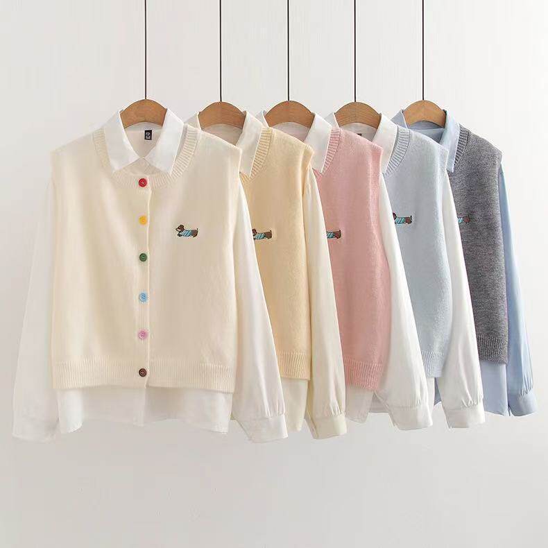 2025秋季彩扣刺绣狗翻领马甲两件套女学院风针织背心+衬衫套装