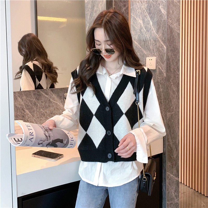 Okaaay【菱格秋冬】早秋学院风针织背心女韩系复古风开衫两件套