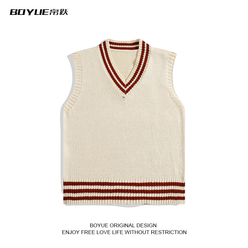 BOYUE帛跃秋冬季宽松休闲撞色V领条纹坎肩学院风针织背心叠穿毛衣